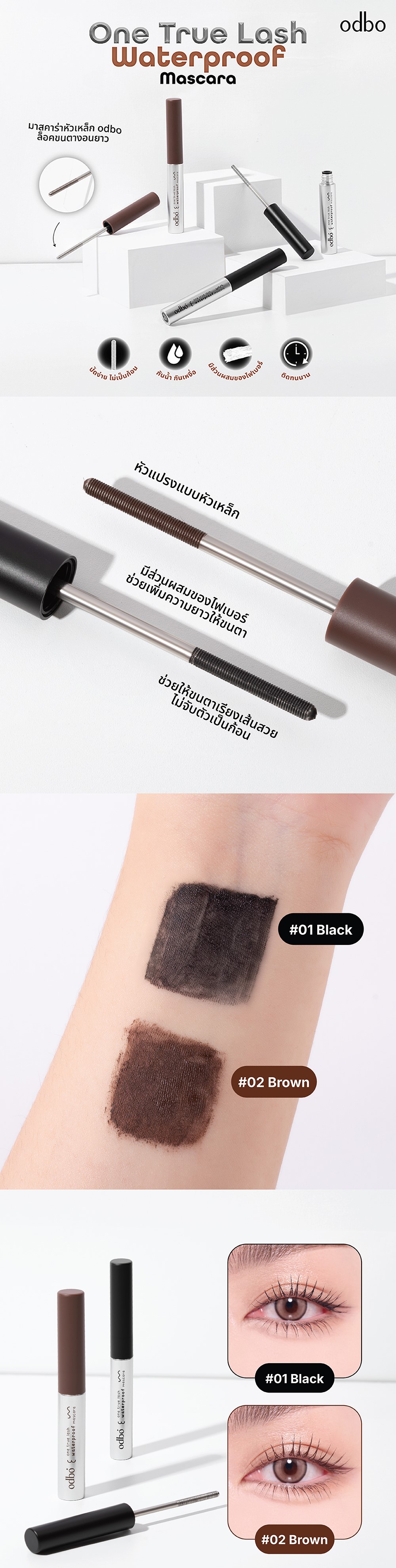 โอดีบีโอ วัน ทรู แลช มาสคาร่า กันน้ำ 02 สีน้ำตาล เป็นมาสคาร่าหัวเหล็กสุดฮอตที่กำลังเป็นกระแส หากคุณกำลังรอสิ่งนี้อยู่ หัวแปรงทำจากสแตนเลสคุณภาพสูง หัวแปรงมีรอยบากเล็กๆ หลายรอย ทำให้ปัดขนตาแต่ละเส้นได้อย่างสม่ำเสมอ สูตรนี้ประกอบด้วยเส้นใยขนาดเล็กที่ช่วยให้ขนตาของคุณยาวขึ้นและงอนงาม กันน้ำ กันเหงื่อ และไม่เลอะเทอะ ช่วยล็อกขนตาของคุณไว้ได้ตลอดทั้งวัน มีให้เลือก 2 เฉดสี ได้แก่ 01 สีดำและ 02 สีน้ำตาล ขนตาที่ดูยาวขึ้นอย่างเป็นธรรมชาติจะทำให้ดวงตาของคุณดูโตขึ้น