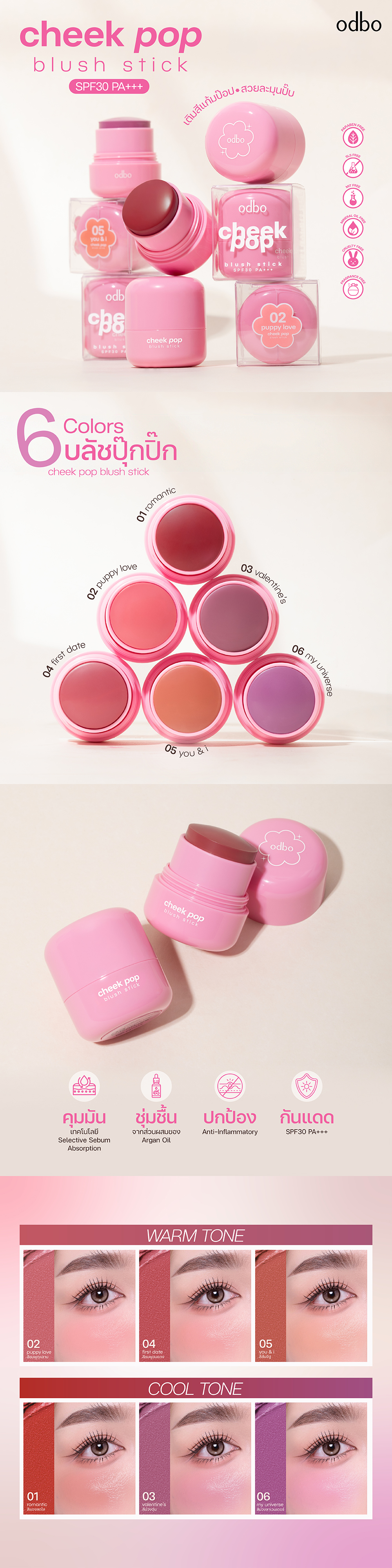 เติแก้มป๊อปสวยละมุนด้วยบลัชออนสติ๊กเนื้อครีม โอดีบีโอ ชีค ป๊อป บลัช สติ๊ก เนื้อบางเบานุ่มลื่น เกลื่ยง่าย ไม่เป็นคราบ เม็ดสีสวยชัด ให้แก้มดูสดใสธรรมชาติ สีติดทนตลอดวัน มาพร้อมเทคโนโลยี Selective sebum absorption ช่วยคงความชุ่มชื่นไว้บนผิวด้วยสารสกัดธรรมชาติจาก Argan Oil ใช้งานง่ายเพียงแค่หมุนขึ้นเบาๆ สามารถใช้ได้ทั้งตา แก้ม ปาก มีให้เลือก 6 เฉดสี สี 01 Romantic โทนสีชมพูแดงแก้มป๊อป สี 02 Puppy Love โทนสีชมพูตุ่น สี 03 Valentines โทนสีม่วงก่ำ สี 04 First Love โทนสีชมพูสดใส สี 05 Youamp;I โทนสีส้มอิฐ สี 06 My Universe โทนสีม่วง