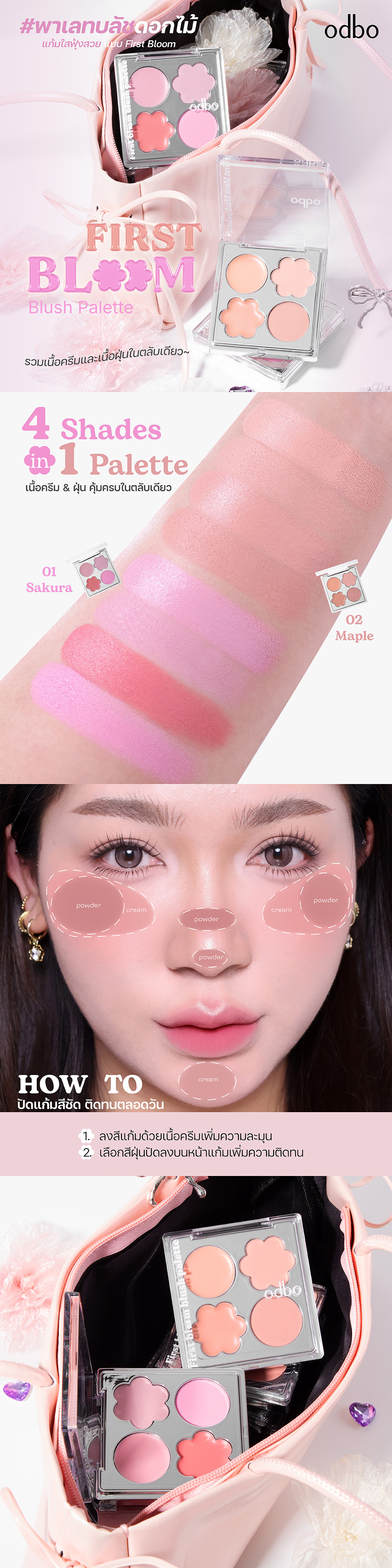 พาเลตต์บลัชที่ช่วยเติมสีสันให้พวงแก้มดูละมุนสดใส เปรียบเสมือนดอกไม้ที่กำลังเบ่งบาน ด้วยการรวม 4 เฉดสีโทนธรรมชาติ ไว้ในตลับเดียว พร้อมเนื้อสัมผัสทั้ง เนื้อครีมและเนื้อฝุ่น เนื้อครีมบลัชมีสัมผัสนุ่มละเอียด เกลี่ยง่าย สีชัด ไม่เป็นก้อน กลืนไปกับผิวอย่างเป็นธรรมชาติ ช่วยให้พวงแก้มดูฉ่ำวาวและมีสุขภาพดี ส่วนเนื้อฝุ่นบลัชให้เม็ดสีแน่น เบลนด์ง่าย ติดทนนาน มาพร้อมฟินิชทั้งแบบแมตต์ละมุนและกลิตเตอร์เนื้อละเอียดแวววาว ช่วยเพิ่มมิติให้แก้มดูสวยโดดเด่นมีให้เลือก 2 เฉดสี01 Sakura (ซากุระ) โทนชมพูอ่อน หวานละมุน02 Maple (เมเปิ้ล)โทนพีชน้ำตาล ธรรมชาติ
