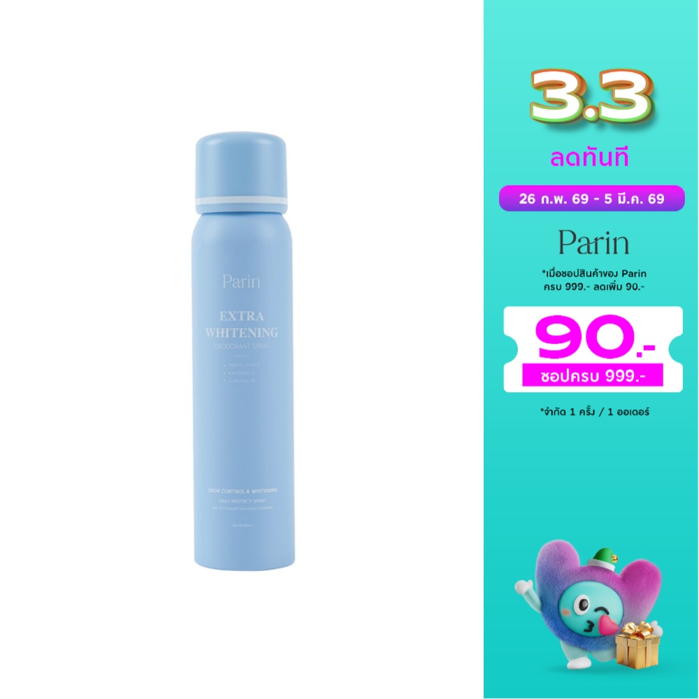 Parin Extra Whitening Deodorant Spray พาริน เอ็กซ์ตร้า ไวท์เทนนิง ดีโอเดอแรนท์ สเปรย์ ระงับกลิ่นกายยาวนาน ระงับเหงื่อ ปรับผิวใต้วงแขนกระจ่างใส บำรุงผิวใต้วงแขนเรียบเนียน ช่วยระงับกลิ่นกายได้ยาวนาน ช่วยยับยั้งการเจริญเติบโตของแบคทีเรียที่ก่อให้เกิดกลิ่นกาย ลดการเกิดตุ่มหนังไก่ ลดการเกิดขนคุด บำรุงผิวใต้วงแขนให้เรียบเนียน แลดูขาวกระจ่างใสเนื้อบางเบา ไม่ก่อให้เกิดการอุดตัน อุดมไปด้วยสารสกัดหลักช่วยฟื้นบำรุงผิว ZINC CITRATE ลดปริมาณเชื้อแบคทีเรียที่เป็นสาเหตุของการเกิดกลิ่นกาย ALPHA-ARBUTIN ยับยั้งการผลิตเม็ดสีเมลานิน ปรับสีผิวทำให้ผิวกระจ่างใส TOCOPHEROL ชะลอการเสื่อมสภาพของเซลล์ผิว ลดริ้วรอยเหี่ยวย่นและเพิ่มความชุ่มขึ้นให้แก่ผิว ALUMINUM CHLOROHYDRATE : ระงับเหงื่อและลดกลิ่นกาย เนื่องจากมีฤทธิ์ยับยั้งการเจริญเติบโตของแบคทีเรียที่เป็นสาเหตุของการเกิดกลิ่นกาย ALLANTOIN ช่วยลดการอักเสบ บวมแดงและยังป้องกันการระคายเคืองแม้ผิวที่บอบบางแพ้ง่าย ช่วยเก็บกักน้ำหล่อเลี้ยงผิว ให้ผิวนุ่มชุ่มชื้นอยู่ตลอดเวลา TALC ดูดซับความขึ้น ไม่เหนียวเหนอะหนะ ผ่านการทดสอบการระคายเคืองจากสถาบัน Dermscan Asia Co LTD