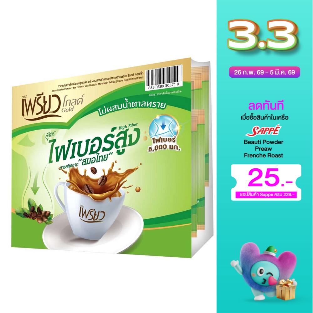 กาแฟเพรียวสูตรไฟเบอร์สูง ผสมสารสกัดสมอไทย เป็นกาแฟที่ช่วยในการขับถ่าย และดูแลตั้งแต่กระเพาะอาหารจนถึงลำไส้ เพราะมีไฟเบอร์สูงมากถึง 5,000 มก.รวมถึงมีสารสกัดจากสมอไทย ซึ่งมีส่วนช่วยในการยับยั้งเซลล์มะเร็งและต้านเชื้อแบคทีเรียที่ก่อให้เกิดแผลในกระเพาะอาหารได้ พูดได้เลยว่า “เพรียวไฟเบอร์” ไม่ได้ช่วยแค่เรื่องการขับถ่าย แต่ยังช่วยปรับสมดุลลำไส้ให้คุณได้ ทำให้คุณสามามารถขับถ่ายได้อย่างมีประสิทธิภาพ ไม่ปวดบิด ไม่ถ่ายเหลวเป็นน้ำ ตอบโจทย์กลุ่มผู้บริโภคที่มีปัญหาด้านการขับถ่าย รวมถึงคนที่ต้องการปรับสมดุลลำไส้ หรือรับประทานอาหารมื้อหนักๆ มาและต้องการการขับถ่ายที่ดี หมดกังวลว่าจะมีน้ำหนักเกินเพราะในซองนี้ไม่ผสมน้ำตาล 0% เพียงทานวันละ 1 ซอง How to prepare the coffee: ชงกาแฟ 1 ซอง 16 กรัม ต่อน้ำร้อน 1 ถ้วย (120 มิลลิลิตร)