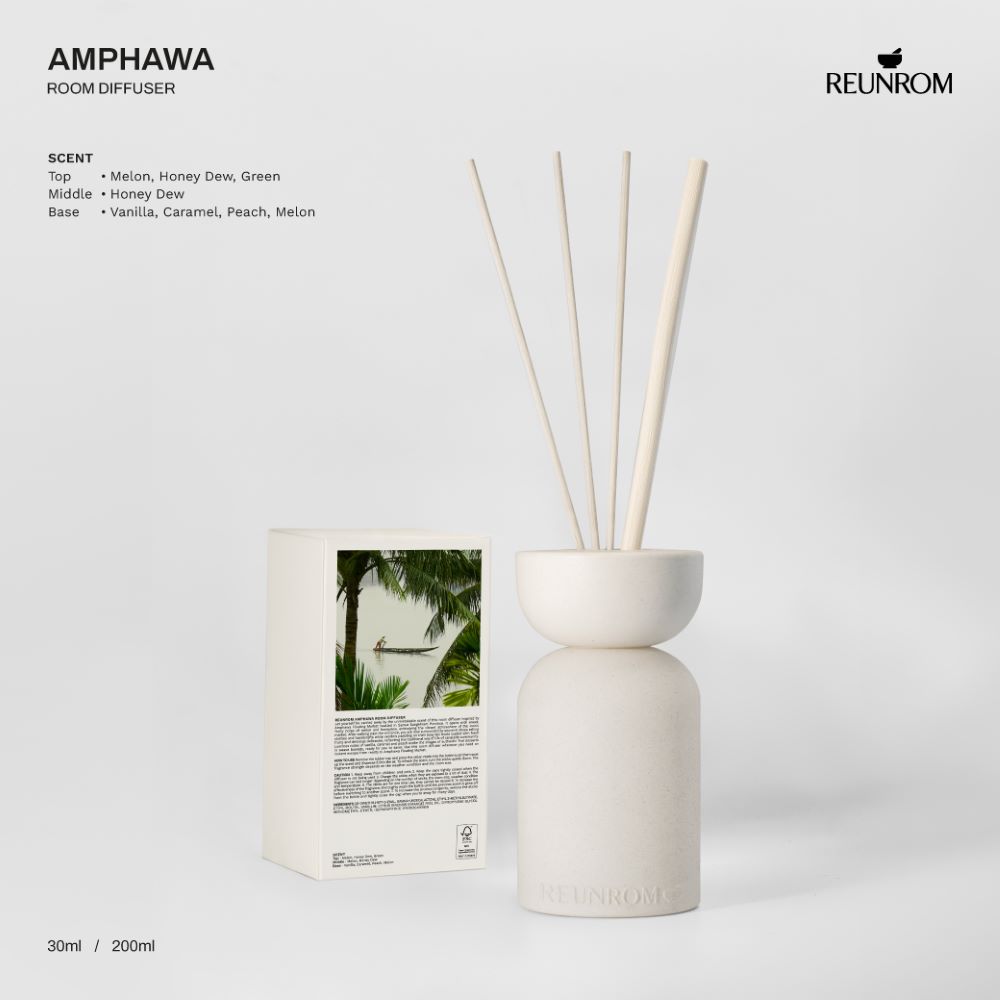 ผลิตภัณฑ์ก้านหอมปรับอากาศ ที่ได้แรงบันดาลใจจากตลาดน้ำอัมพวา จังหวัดสมุทรสงคราม ภาพของร้านรวงที่มีเสน่ห์เป็นเอกลักษณ์ มีแม่ค้า พ่อค้าที่พายเรือขายผลไม้สดๆ จากสวน เนืองแน่นอยู่ริมฝั่งแม่น้ำ สะท้อนออกมาด้วยกลิ่นของเมลอนและฮันนี่ดิว ตัวแทนความหอมจากผลไม้หวานสด ได้กลิ่นครั้งใดก็มีกลิ่นอายของการค้าขายแบบตลาดน้ำเก่าแก่ สะท้อนวิถีชีวิตชุมชนริมน้ำที่รื่นเริง มีชีวิตชีวา และเต็มไปด้วยความสดชื่น ผสานเข้ากับกลิ่นของวานิลลา คาราเมล และพีช หวานละมุนเหมือนกลิ่นของขนมไทยนานาชนิด ที่วางเรียงรายอยู่ในตะกร้าหาบสาน รอให้ผู้คนได้แวะมาชิมขนมรสชาติดั้งเดิมแบบไทยแท้ ได้กลิ่นครั้งใดก็รู้สึกเป็นสุขและเบิกบานใจ เหมือนได้ไปเดินเที่ยวเล่นเพลิดเพลินใจไปกับวิถีแห่งชุมชน ณ ตลาดน้ำอัมพวา