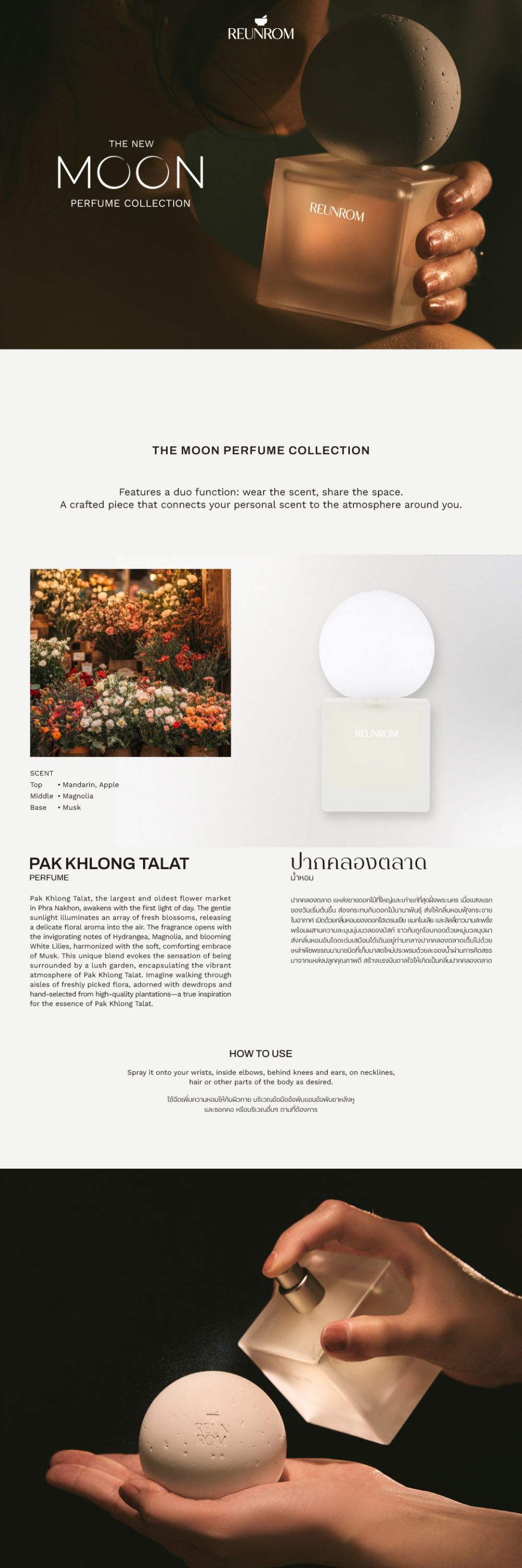 น้ำหอมที่ได้รับแรงบันดาลใจมาจากตลาดปากคลองตลาด ตลาดดอกไม้ยอดนิยมที่ใหญ่และเก่าแก่ที่สุดของกรุงเทพฯ ตั้งอยู่ในเขตพระนคร บรรยากาศเต็มไปด้วยร้านค้าดอกไม้นานาพันธุ์ที่คัดสรรมาจากแหล่งปลูกคุณภาพดีทั่วประเทศไทย ด้วยกลิ่นหอมของดอกไฮเดรนเยีย แมกโนเลีย และลิลลี่ขาวที่บานสะพรั่ง ถูกจัดเป็นช่อดอกไม้ที่แสนหรูหราและประณีต ผสานกลิ่นหอมสดชื่นผ่อนคลายของใบไม้สีเขียวสด และกลิ่นหอมละมุนนุ่มนวลของมัสก์ที่ช่วยเติมเต็มให้ช่อดอกไม้นั้นสมบูรณ์ ได้กลิ่นครั้งใด ก็เสมือนได้เดินเพลิดเพลินอยู่ท่ามกลางร้านดอกไม้ใจกลางเมืองหลวง ณ ปากคลองตลาด วิธีใช้ ใช้ฉีดเพิ่มความหอมให้กับผิวกาย บริเวณข้อมือ ข้อพับแขน ข้อพับขา หลังหู และซอกคอ หรือบริเวณอื่นๆ ตามที่ต้องการ คำเตือน หากใช้แล้วมีความผิดปกติใด ๆ เกิดขึ้น ต้องหยุดใช้และปรึกษาแพทย์หรือเภสัชกร