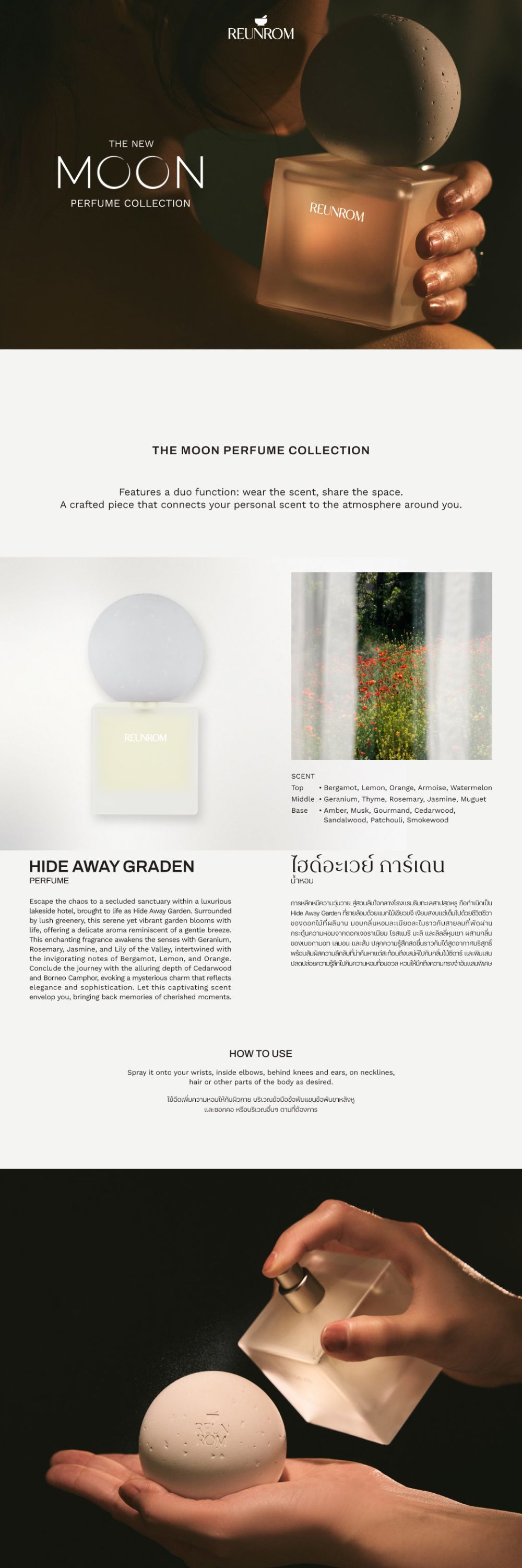 น้ำหอมที่ได้รับแรงบันดาลใจมาจากอ่าวไทย ความงดงามของธรรมชาติอันเป็นเอกลักษณ์ของท้องทะเลไทย สัมผัสประสบการณ์อันแสนพิเศษ ความสดชื่นของสายลมทะเลและความหอมอบอุ่นของดอกเจอราเนียม โรสแมรี มะลิ และลิลลี่หุบเขา เหมือนการได้เดินเล่นบนชายหาดทรายขาวละเอียด พร้อมด้วยกลิ่นหอมของเบอร์กามอท ฝรั่ง เลมอน และส้ม ปลุกความรู้สึกกระปรี้กระเปร่าราวกับได้สูดอากาศบริสุทธิ์ท่ามกลางแสงแดดอ่อนๆ ปิดท้ายด้วยการพักผ่อนหย่อนใจในโรงแรมหรูริมทะเล ด้วยกลิ่นไม้ซีดาร์และพิมเสน ช่วยให้คุณรู้สึกผ่อนคลายราวกับได้ปลดปล่อยความรู้สึกไปกับกลิ่นสายลมแห่งท้องทะเล ณ อ่าวไทย วิธีใช้ ใช้ฉีดเพิ่มความหอมให้กับผิวกาย บริเวณข้อมือ ข้อพับแขน ข้อพับขา หลังหู และซอกคอ หรือบริเวณอื่นๆ ตามที่ต้องการ คำเตือน หากใช้แล้วมีความผิดปกติใด ๆ เกิดขึ้น ต้องหยุดใช้และปรึกษาแพทย์หรือเภสัชกร