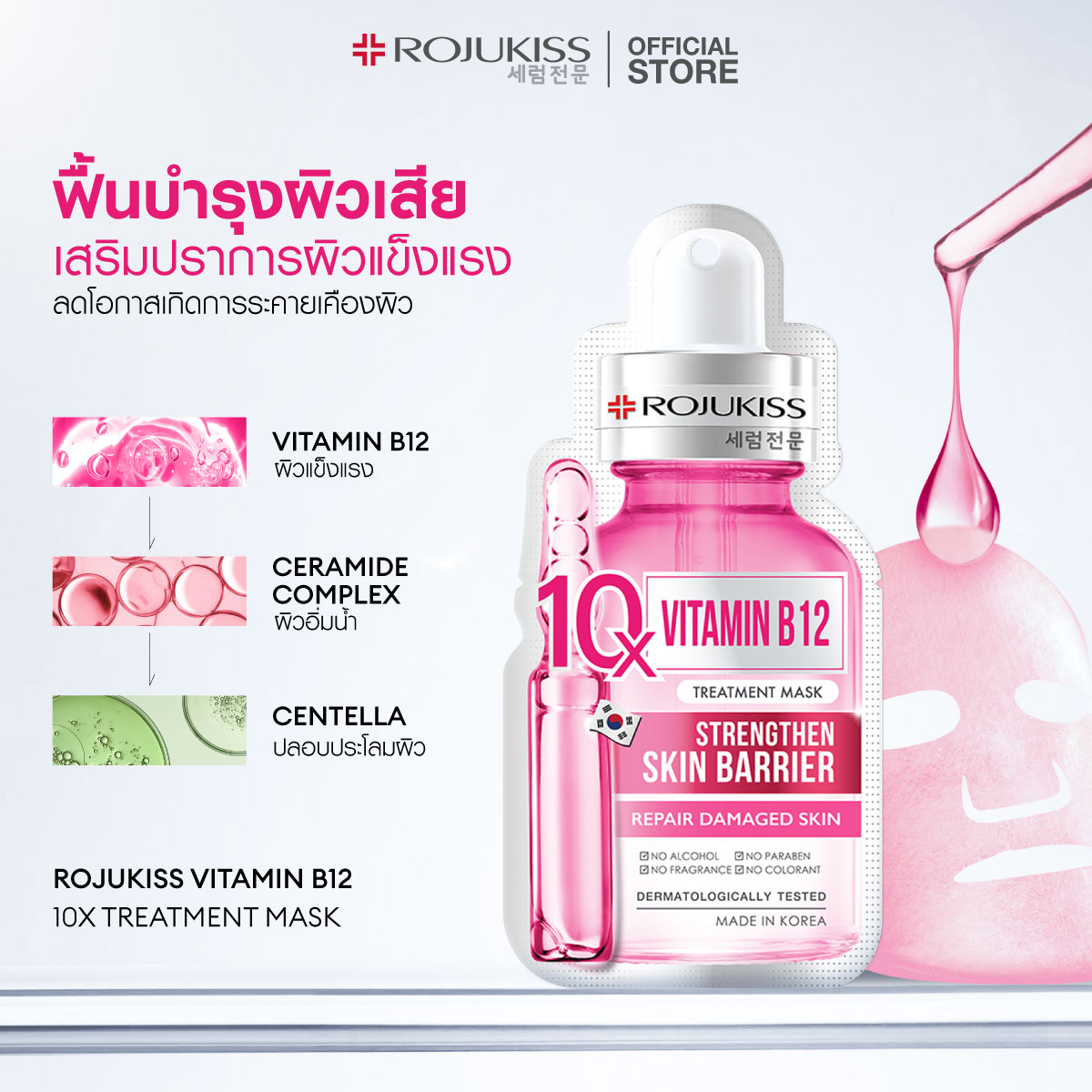แผ่นมาส์กหน้าทรีตเมนต์เข้มข้น 10 เท่า ผสาน Vitamin B12 , Ceramide Complex, Panthenol และ Centella ฟื้นบำรุงผิวเสีย เสริมปราการผิวแข็งแรง ลดโอกาสเกิดการระคายเคืองผิว ปลอบประโลมและฟื้นบำรุงผิวอย่างอ่อนโยน เข้มข้นเห็นผล และอ่อนโยนต่อผิว - ผ่านการทดสอบการะระคายเคืองต่อผิว NO ALCOHOL NO PARABEN NO FRAGRANCE NO COLORANT - เมื่อเทียบสาร Sodium Hyaluronate ใน Rojukiss White Poreless Serum แผ่นมาส์กหน้าทรีตเมนต์เข้มข้น 10 เท่า ผสาน Vitamin B12 , Ceramide Complex, Panthenol และ Centella ฟื้นบำรุงผิวเสีย เสริมปราการผิวแข็งแรง ลดโอกาสเกิดการระคายเคืองผิว ปลอบประโลมและฟื้นบำรุงผิวอย่างอ่อนโยน เข้มข้นเห็นผล และอ่อนโยนต่อผิว