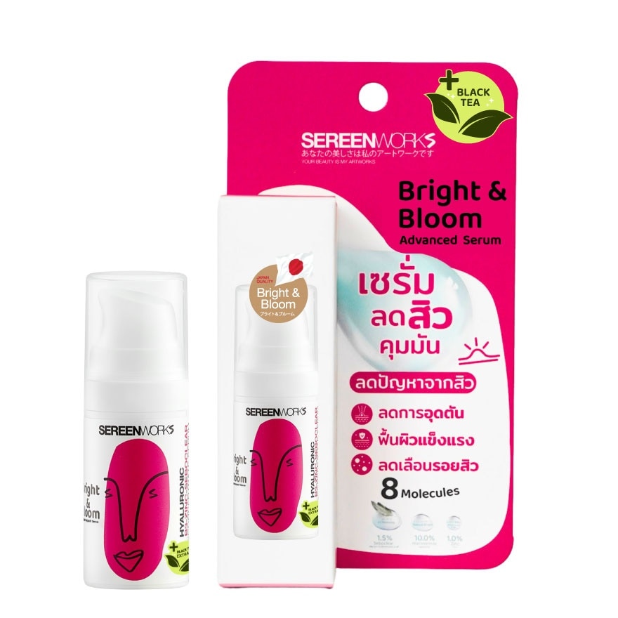ซีรีนเวิร์ค ไบร์ท แอนด์ บลูม แอดวานซ์ เซรั่ม เซรั่มสำหรับผิวมีปัญหาสิว รอยดำ รอยแดง ผิวมันอุดตันง่าย ช่วยปัญหาสิวพร้อมเติมสมดุลความชุ่มชื้นเหมาะสำหรับผู้ที่มีผิวแห้งหรือระคายเคืองง่าย โดยเซรั่มตัวนี้จะช่วยให้ผิวรู้สึกสงบ และชุ่มชื้นอย่างสบายผิว ส่วนประกอบสำคัญ Niacinamide 10% ช่วยปลอบประโลมผิว เสริมเกราะป้องกันผิว และช่วยให้รอยดำ รอยแดงดูจางลง Zinc PCA 1% แก้ปัญหามันส่วนเกิน ซึ่งเป็นหนึ่งในสาเหตุหลักของการอุดตันและเกิดสิว Seboclear 1.5% ไม่ก่อการสะสมของแบคทีเรียที่ทำให้เกิดสิวบนผิว Hyaluronic Acid (8 โมเลกุล) ให้ความชุ่มชื้นล้ำลึก เติมเต็มผิว และช่วยให้ผิวกระชับแลดูอิ่มฟู Black Tea Extract BG เสริมสภาพผิวให้ผลัดเซลล์ได้ดีขึ้นอย่างเป็นธรรมชาติ
