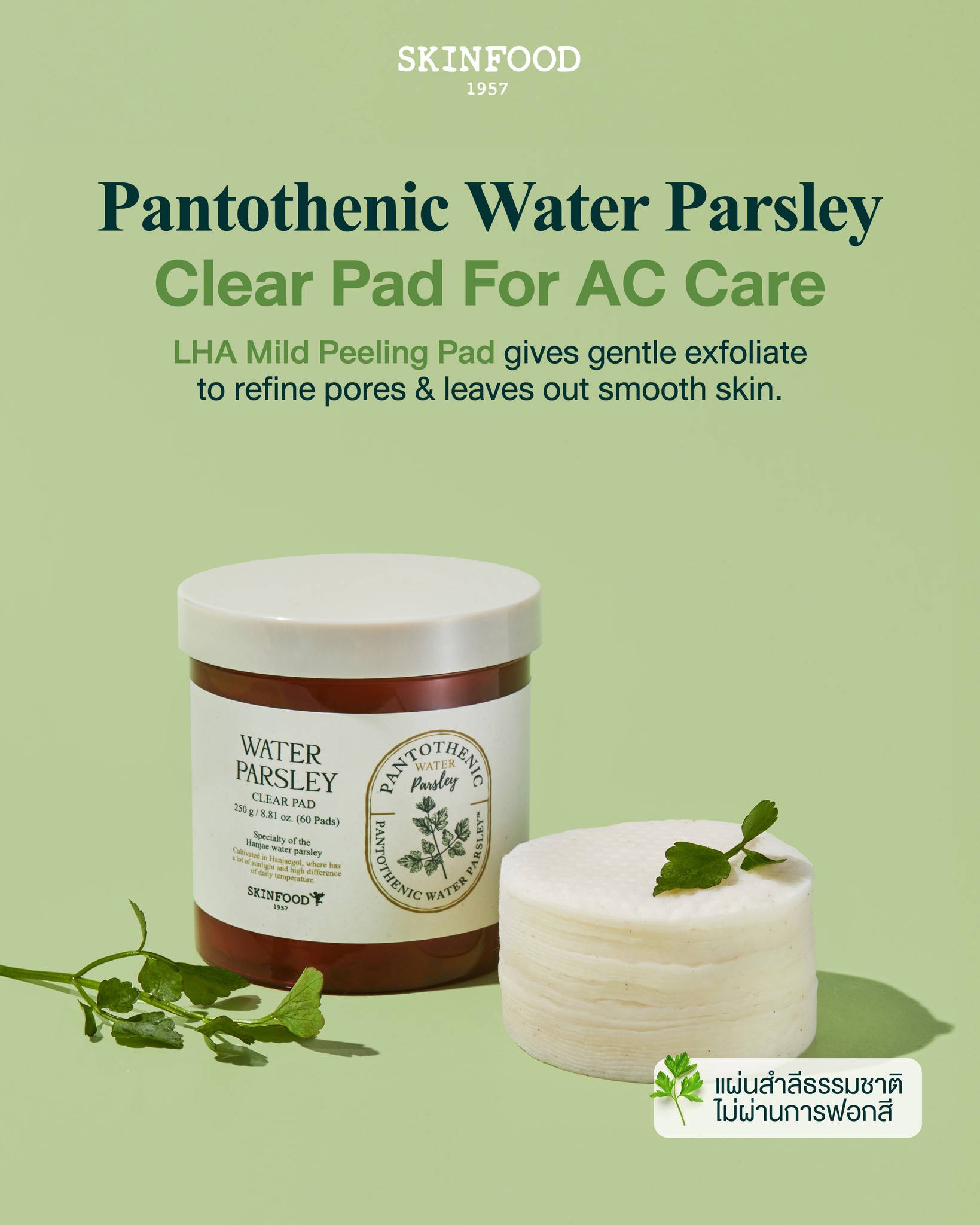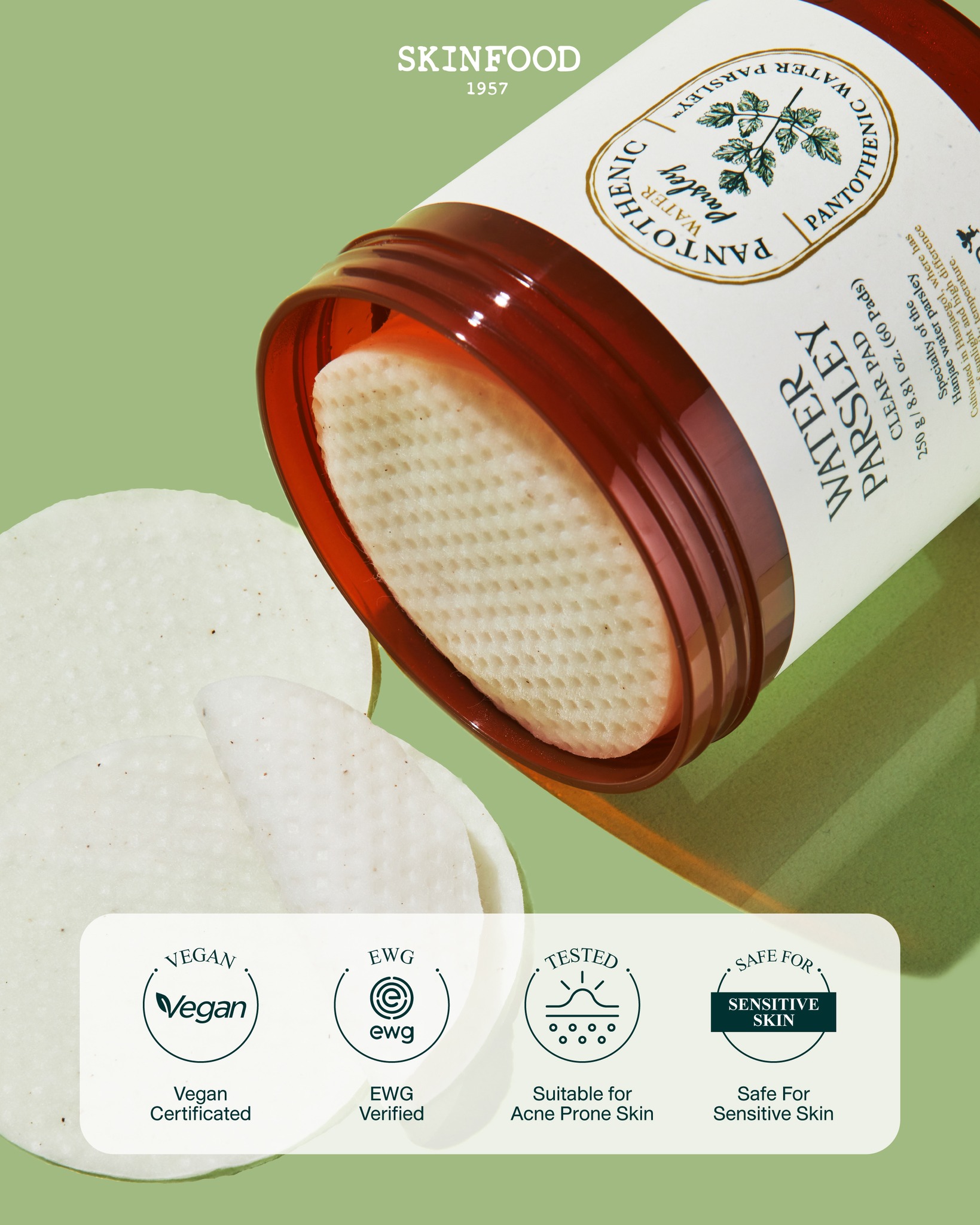 สกินฟู๊ด แพนโทเทนิก พาร์สลีย์ เคลียร์ แพด แผ่นบำรุงผิวเฉพาะจุด สูตรสารสกัดจากผักชีล้อมธรรมชาติ ที่ผสาน Pantothenic Acid, Capryloyl Salicylic Acid หรือ LHA และ Allantoin คุมมัน ผลัดเซลล์ผิวอย่างอ่อนโยน ปรับสีผิวให้เรียบเนียน สม่ำเสมอ พร้อมทั้งช่วยปลอบประโลมและคืนความชุ่มชื่นให้แก่ผิว เหมาะสำหรับผิวที่เป็นสิวง่าย ด้วยแผ่นสำลีธรรมชาติที่ไม่ผ่านการฟอกสีจะช่วยส่งผ่านสารบำรุงเข้าสู่ผิวได้อย่างเต็มประสิทธิภาพโดยไม่ก่อให้เกิดการระคายเคือง ผ่านการทดสอบการระคายเคืองจากแพทย์ผิวหนัง ผลิตภัณฑ์นี้ไม่ได้ทำการทดลองกับสัตว์ 7 Free ปราศจาก พาราเบน แอลกอฮอล์ สี ซิลิโคน น้ำมันแร่ สารกันเสีย และไตรเอทาโนลาไมน์ (ทีอีเอ)