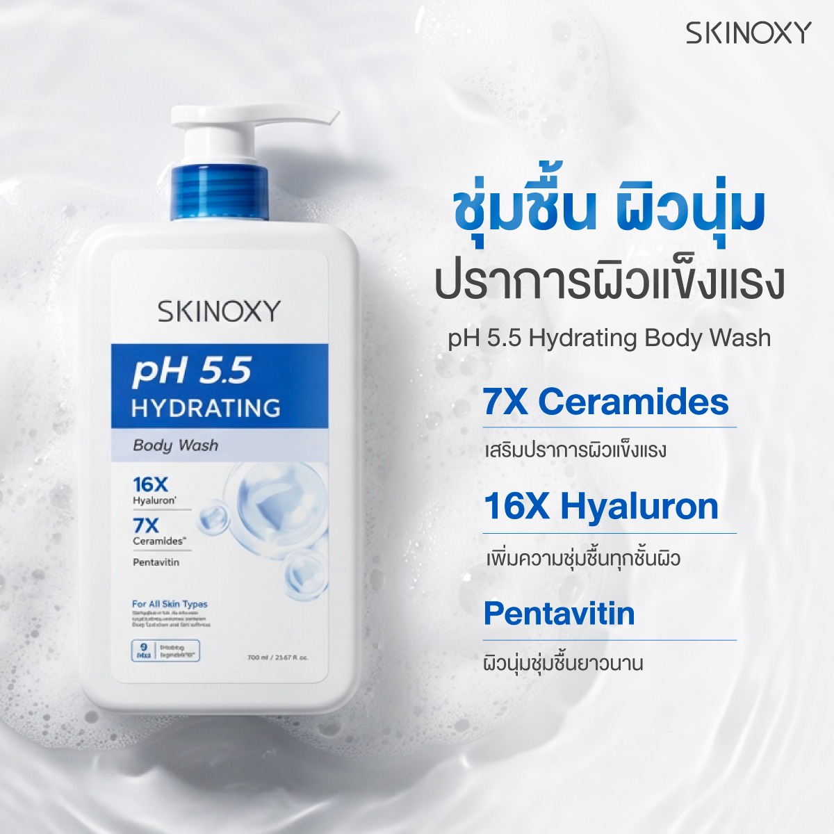สกินอ็อกซี่ พีเอช 5.5 ไฮเดรติ้ง บอดี้ วอช ครีมอาบน้ำสูตรอ่อนโยน pH 5.5 ใกล้เคียงกับผิวธรรมชาติ ช่วยทำความสะอาดผิวได้อย่างหมดจด โดยไม่ทำลายสมดุลผิว พร้อมมอบการบำรุงให้ผิวรู้สึกนุ่ม ชุ่มชื้น และไม่แห้งตึงหลังอาบน้ำ อุดมด้วย 16X ไฮยาลูรอน ที่ช่วยเติมความชุ่มชื้นล้ำลึกทุกชั้นผิว ให้ผิวดูอิ่มน้ำ เรียบเนียน เปล่งปลั่ง เสริมด้วย 7X เซราไมด์ เสริมปราการเกราะป้องกันผิว ลดการสูญเสียน้ำ พร้อมฟื้นฟูให้ผิวแข็งแรง และ Pentavitin ที่ช่วยกักเก็บความชุ่มชื้นยาวนาน ป้องกันผิวแห้งกร้าน ให้ผิวเนียนนุ่มและดูมีสุขภาพดี