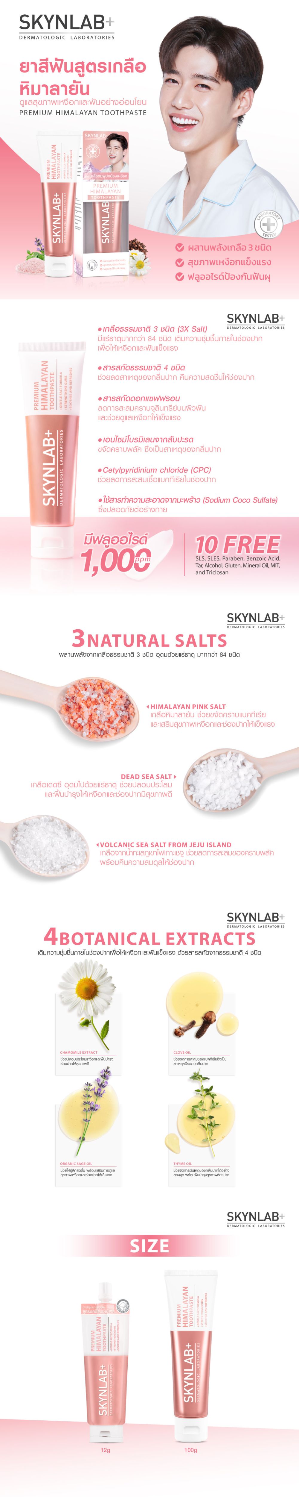 ยาสีฟันพรีเมี่ยมหิมาลายัน ช่วยดูแลสุขภาพเหงือกอย่างอ่อนโยน ช่องปาก ผสานพลังจากเกลือธรรมชาติ 3 ชนิด คือ เกลือหิมาลายันสีชมพู เกลือจากทะเลเดดซี และเกลือแร่ธรรมชาติจากน้ำทะเลภูเขาไฟเกาะเชจู อุดมด้วยแร่ธาตุมากกว่า 84 ชนิด เติมความชุ่มชื้นภายในช่องปากเพื่อให้เหงือกและฟันแข็งแรง ด้วยสารสกัดจากธรรมชาติ 4 ชนิด (Botanical Extracts) จากสารสกัดดอกคาโมมายล์ น้ำมันกานพลู น้ำมันดอกเสจ และน้ำมันใบไทม์ ผสานสารสกัดจากดอกแซฟฟรอน ลดการสะสมคราบจุลินทรีย์บนผิวฟันและช่วยดูแลเหงือกให้แข็งแรง เอนไซม์โบรมิเลนจากสับปะรด ขจัดคราบพลัค ซึ่งเป็นสาเหตุของกลิ่นปาก มี Cetylpyridinium chloride (CPC) ช่วยลดการสะสมเชื้อแบคทีเรียในช่องปาก พร้อมด้วยฟลูออไรด์ช่วยป้องกันฟันผุ ใช้สารทำความสะอาดจากมะพร้าว (Sodium Coco Sulfate) ซึ่งปลอดภัยต่อร่างกาย ปราศจาก 10 ชนิด SLS, SLES, Paraben, Benzoic Acid, Tar, Alcohol, Gluten, Mineral Oil, MIT และ Triclosan ทำความสะอาดอย่างล้ำลึก เพื่อลมหายใจหอมสดชื่นตลอดวัน