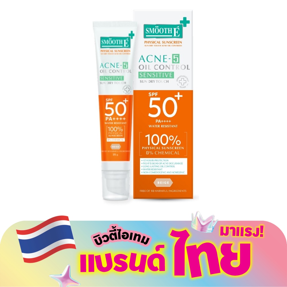 สมูทอี ฟิซิคอล ซันสกรีน ซัน ดราย ทัช แอคเน่ ออยคอนโทรล เอสพีเอฟ 50+ พีเอ ++++ (สีเบจ) วอเตอร์ รีซิสแต้นท์ ครีมกันแดดสำหรับผู้มีปัญหาสิวหรือเป็นสิวง่าย ปกป้องยาวนาน 12 ชั่วโมง ปกป้องการเกิดสิว กระ ฝ้า และริ้วรอยระหว่างการใช้ และ ปรับสมดุลความมันของผิว กันน้้า คงไว้ซึ่งการปกป้องผิวแม้สัมผัสกับน้้าหลังจากผ่านไป 40 นาที ประกอบด้วย Zinc Oxide และ Titanium Dioxide เป็นสารกันแดดชนิดกายภาพ (Physical Sunscreen) สะท้อนรังสี UVA และ UVB จึงป้องกันได้ทั้งผิวไหม้ (Burn) จาก UVB และริ้วรอย (Aging) ที่เกิดจาก UVA