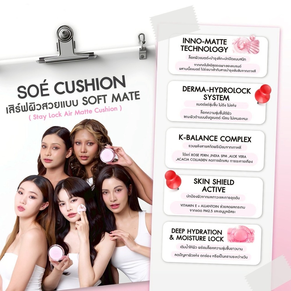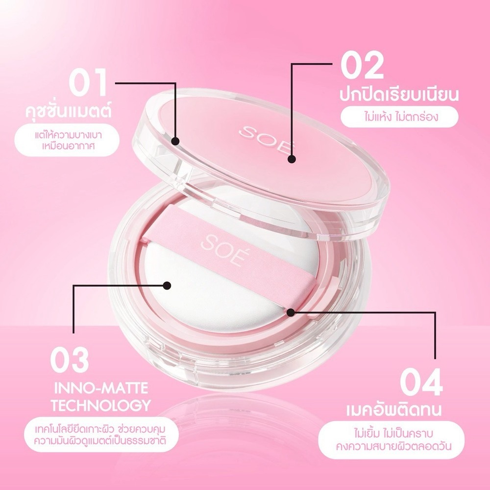 โซเอ้ สเตย์ ล็อค แอร์ แมทท์ คุชชั่น เอสพีเอฟ 42 พีเอ+++ ขนาดบรรจุ 15 กรัม คุชชั่นเนื้อแมตต์บางเบา มอบฟินิชแบบ Soft Matte ปกปิดเรียบเนียน ไม่แห้งหรือตกร่อง ด้วย INNO-MATTE TECHNOLOGY ช่วยควบคุมความมัน ติดทนนาน ไม่เยิ้ม ไม่เป็นคราบ และสบายผิวตลอดวัน มีสารสกัด 7 ชนิด นาโนไวท์ ช่วยปรับโทนสีผิวให้สว่างและสดใสขึ้น อัลฟ่า อาบูติน ช่วยลดเลือนฝ้าบนใบหน้า วิตามินอี ช่วยให้ผิวแข็งแรง ลดการอักเสบของผิว โจโจบาออยล์ ช่วยเรื่องผิวอ่อนโยน ผิวแพ้ง่ายใช้ได้ อะมิโน แอซิด 39ไทป์ ช่วยเรื่องกักเก็บความชุ่มชื่น ให้แก่ผิว โดยไม่เพิ่มความมัน เจจู ซี วอเตอร์ ช่วยเพิ่มความชุ่มชื่นล้ำลึก เพื่อให้ผิวสามารถต่อสู้กับริ้วรอยที่กำลังก่อตัวขึ้น อโลเวร่า เอ็กศ์แทร็ก ช่วยลดการระคายเคือง เพิ่มความชุ่มชื่นให้แก่ผิว