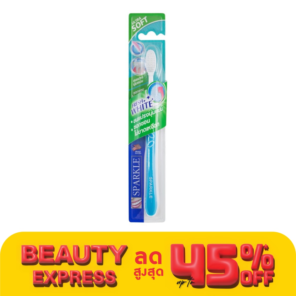 แปรงสีฟัน สปาร์คเคิล รุ่น เฟรช ไวท์ ฟันขาว สะอาดทั่วถึง พร้อมลดเลือดออกขณะแปรงฟัน ลดแรงกดขณะทำความสะอาด เพื่อถนอมเหงือกและฟัน ฟันขาวสะอาด สุขภาพเหงือกและฟันแข็งแรง ซอกซอนทำความสะอาดได้ดีในช่องปาก ด้วยหัวแปรงกลมมน