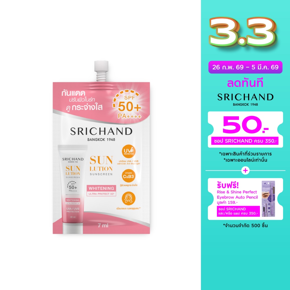 ศรีจันทร์ กันแดดสกินแคร์ SPF50+ PA++++ สูตรไวท์เทนนิ่ง ปริมาณ 7 มล. กู้ผิวขาว กระจ่างใส กันแดดสูตรไวท์เทนนิ่ง Triple Protection ปกป้องผิวจากรังสี UVA/ UV มลภาวะ และ Anti Blue light พร้อมบํารุงกู้ผิวสวย คืนความกระจ่างใส เนื้อบางเบาเบลอรูขุมขน ใช้แทนเมคอัพเบสได้ Ultra Protect X3 UVA/ UVB Anti Pollution Bluelight Vitamin B3 และ C ปรับผิวกระจ่างใส บํารุงลึก ผิวชุ่มชื่น ไม่คลํ้าเสีย Sun Lock Technology เนื้อเบา ไม่เหนอะหนะ ซึมสู่ผิวได้อย่างรวดเร็ว Micro-blur primer ดูดซับความมัน เบลอริ้วรอย ผิวดูกระชับ