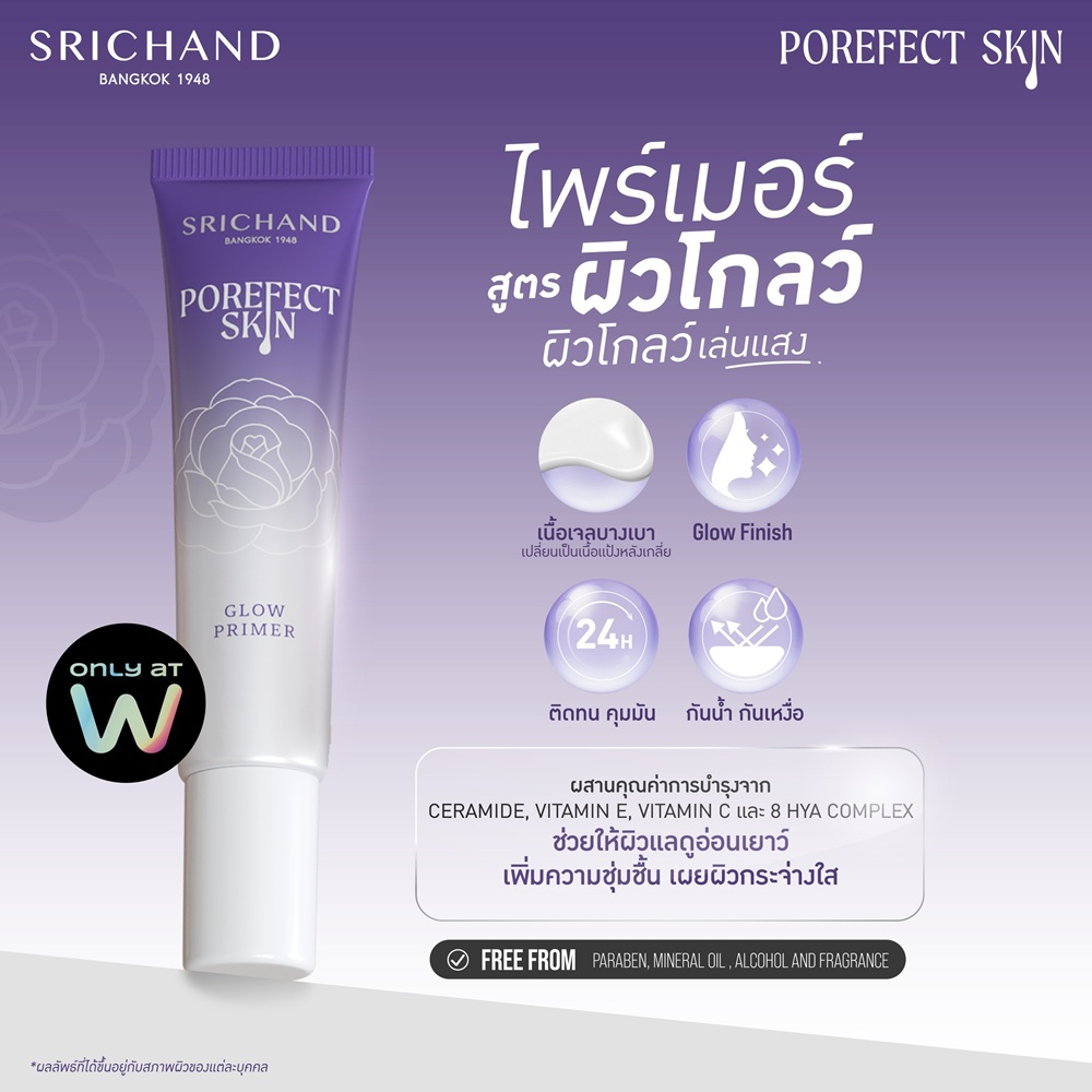 ศรีจันทร์ พอร์เฟกต์ สกิน โกลว์ ไพร์เมอร์ ไพร์เมอร์สูตรผิวโกลว์ เนื้อเจลบางเบา ผสานผงมุกที่ช่วยกระเจิงแสง อำพรางรูขุมขน และริ้วรอยให้แลดูเล็กลง มอบผิวฉ่ำวาวเล่นแสง เผยผิวเรียบเนียนในช่วงเวลาที่ใช้ผลิตภัณฑ์ ให้ผิวนุ่มชุ่มชื้นยาวนาน 12 ชั่วโมง กันน้ำ กันเหงื่อ อุดมไปด้วยสกินแคร์จาก 8HYA CERAMIDE VITAMIN E และ C ที่ช่วยเติมความชุ่มชื้นให้ผิวแลดูอิ่มน้ำให้ผิวดูอ่อนเยาว์ และช่วยให้ผิวแลดูกระจ่างใส เพื่อผิวเนียนสวยสุขภาพดีเปล่งปลั่งสดใสตลอดทั้งวัน ผลลัพธ์ที่ได้ขึ้นอยู่กับสภาพผิวของแต่ละบุคคล ปราศจาก พาราเบน มิเนอรัล ออยล์ น้ำหอม และแอลกอฮอล์