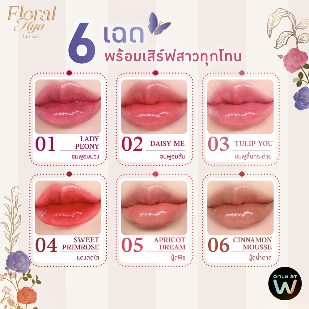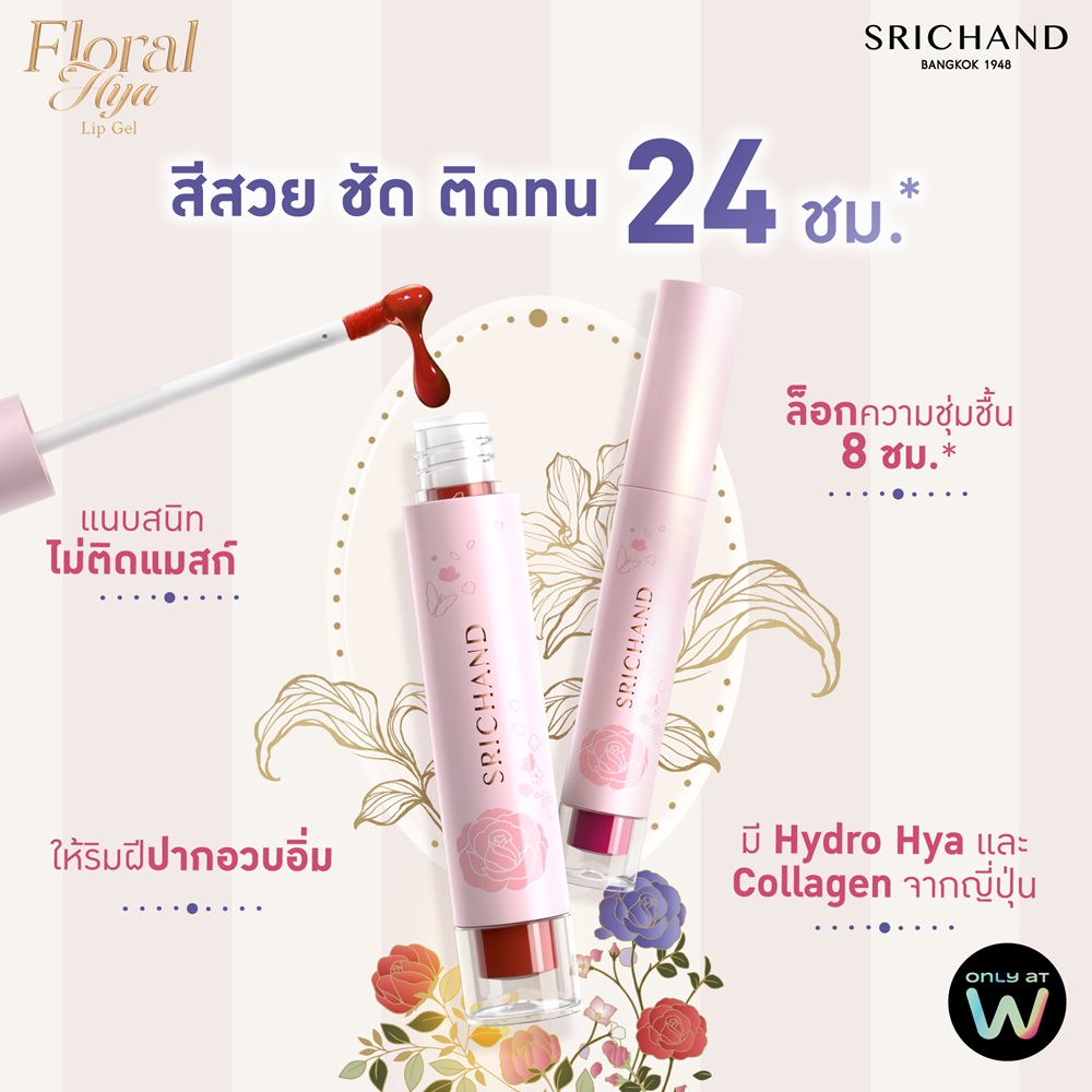ศรีจันทร์ ฟลอรัล ไฮยา ลิป เจล ลิปเจลปากฉ่ำ 24 ชม.ลิปเจล ฉ่ำวาว สีติดทนยาวนานถึง 24 ชั่วโมง และเพิ่มความชุ่มชื้นให้ริมฝีปากอวบอิ่มเรียบเนียนยาวนาน 24 ชั่วโมง ด้วยคุณค่าของ Hydro Hya และ Japanese Collagen ที่ช่วยเติมเต็มริมฝีปาก ให้ฉ่ำวาวอวบอิ่ม เรียบเนียน ดูสุขภาพดี พร้อมด้วย JUICY STAY COATING LAYER เคลือบริมฝีปาก เพียงแค่ปาดเดียว ให้ความฉ่ำวาว พิกเมนต์แน่น สีชัดติดทนยาวนานถึง 24 ชั่วโมง 01 เลดี้ พีโอนี 02 เดซี่ มี 03 ทิวลิป ยู 04 สวีท พริมโรส 05 แอปริคอต ดรีม 06 ซินนามอน มูส Alcohol Free Paraben Free Talc Free