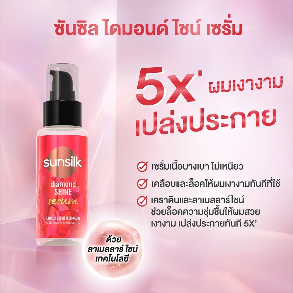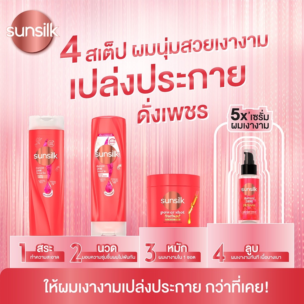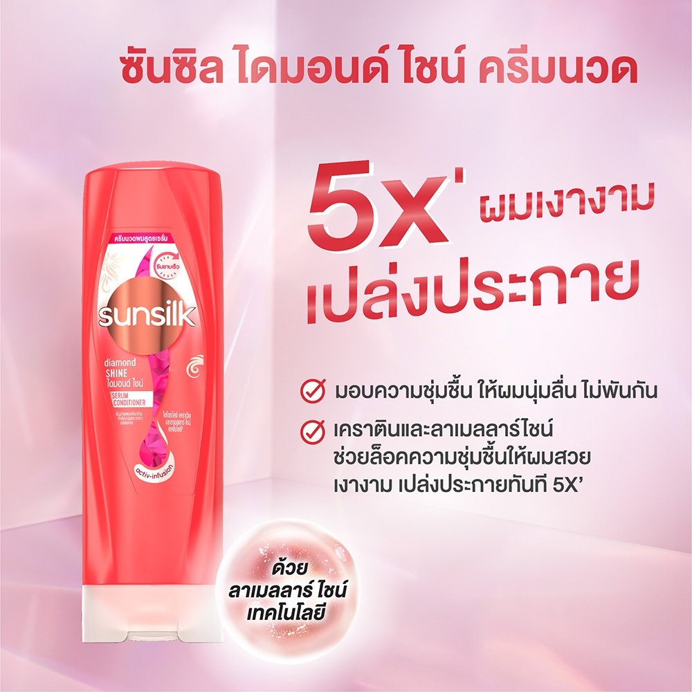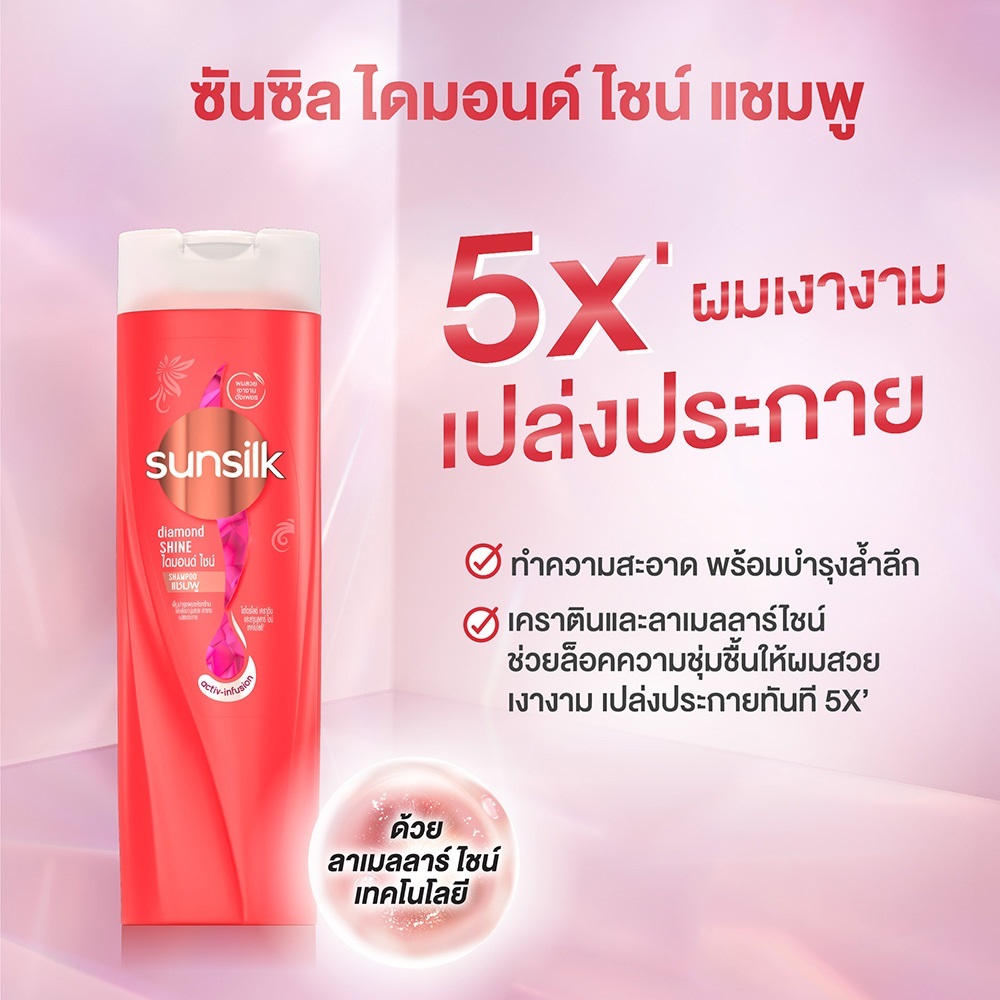 ซันซิล ไดมอนด์ ไชน์ แอคทีฟ-อินฟิวส์ชั่น - เพื่อผมเงางามเปล่งประกายดั่งเพชร บำรุงผมให้สุขภาพดี นุ่มสวยเงางามกว่าที่เคย ทำความสะอาดพร้อมเบำรุงล้ำลึก ผสานพลังไฮโดรไลซ์ เคราติน และลาเมลลาร์ ไชน์ เทคโนโลยี - ไฮโดรไลซ์ เคราติน ซึ่งเป็นที่รู้กันว่าช่วยมอบความชุ่มชื้น พร้อมปรับสภาพผมให้แข็งแรง - ลาเมลลาร์ ไชน์ เทคโนโลยี' เข้าเคลือบเกล็ดผมให้กลับมาเรียงตัวสวย - เคลือบบำรุงพร้อมล็อกความชุ่มชื้นทันที ให้ผมกลับมานุ่มสวย เงางามเปล่งประกายกว่าที่เคย - เมื่อใช้ครบชุดผลิตภัณฑ์แชมพู ครีมนวด ทรีทเม้นต์ และเซรั่ม