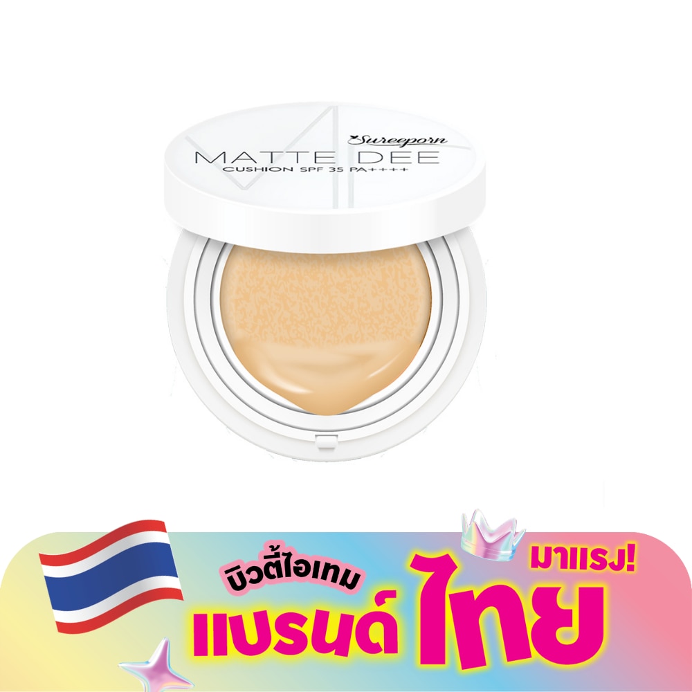 สุรีย์พร แมท ดี คุชชั่น SPF35 PA++++ คุชชั่นเนื้อแมท เนรมิตผิวสวย เกลี่ยง่าย สบายผิว ช่วยปกปิดจุดด่างดำ และริ้วรอยบนใบหน้าได้อย่างเรียบเนียน พร้อมด้วยเทคโนโลยีพิเศษที่ช่วยคุมความมันบนผิวหน้า กันน้ำ กันเหงื่อ ติดทนนานตลอดทั้งวัน มีสารสกัดกันแดด ที่ช่วยปกป้องผืวจากภัยแดดด้วยค่า SPF35 PA+++ เนื้อบางเบา ใช้แล้วไม่หนักหน้า ช่วยเบลอรูขุมขน รอยสิว กระ ฝ้า และจุดด่างดำ พร้อมปรับผิวให้ดูสว่างกระจ่างใสอย่างเป็นธรรมชาติ ควบคุมความมัน ไม่อุดตันรูขุมขน และสามารถกันน้ำได้ ปกปิดจึ้ง ต้องยกให้คุชชั่นสุรีย์พร เซ็ตตัวอยู่บนผิวได้ทั้งวัน ไม่ติดแมสก์