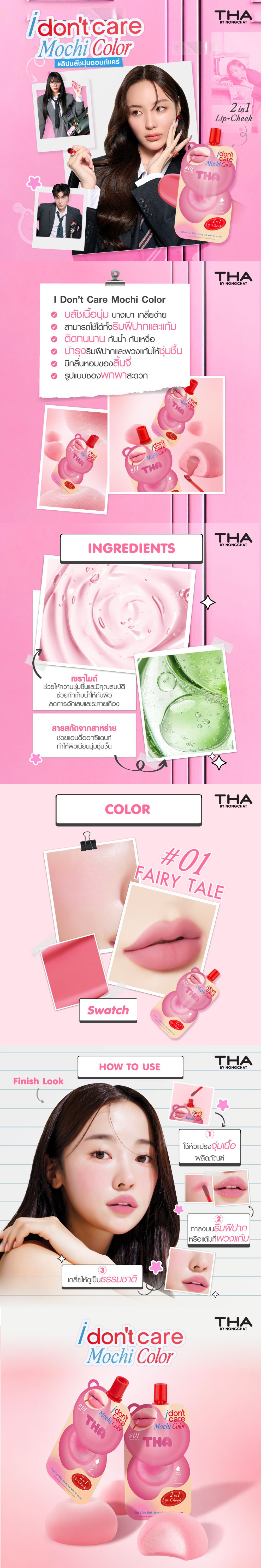 THA BY NONGCHAT ไอดอนท์แคร์โมจิคัลเลอร์ 2g 01 แฟรี่เทล ฑาบายน้องฉัตร บลัชเนื้อนุ่ม เติมความสดใสให้ใบหน้า สามารถทาได้ทั้งแก้มและปาก ให้ลุคดูเป็นธรรมชาติ เนื้อบางเบา เกลี่ยง่าย ติดทน กันน้ำ มีกลิ่นหอมของลิ้นจี่ มาในรูปแบบซอง พกพาสะดวก มีเซราไมด์ ช่วยให้ความชุ่มชื้นและมีคุณสมบัติช่วยกักเก็บน้ำให้กับผิว ลดการอักเสบและระคายเคือง วิธีใช้ จุ่มเนื้อผลิตภัณฑ์ใช้หัวแปรงแต้มลงบนแก้ม หรือทาลงบนริมฝีปาก แล้วเกลี่ยให้ดูเป็นธรรมชาติ และควรเก็บไว้ในอุณหภูมิห้อง หลีกเลี่ยงพื้นที่ที่มีแสงส่องโดยตรง ข้อควรระวัง หากใช้แล้วมีความผิดปกติใด ๆ เกิดขึ้น ต้องหยุดใช้และปรึกษาแพทย์หรือเภสัชกร