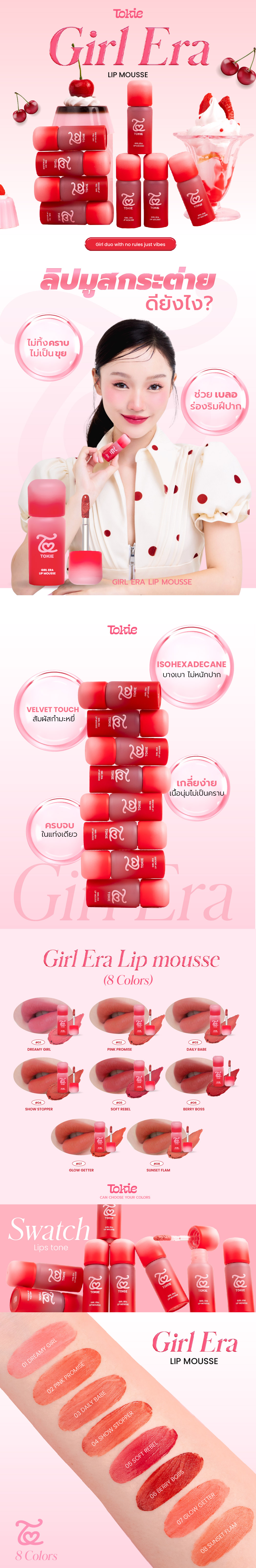 เริ่มวันใหม่ด้วยรอยยิ้ม ให้ความรู้สึกสดชื่น เหมาะกับวันสบต้อนรับยุคใหม่ของริมฝีปากสวยละมุนในแบบ TOKIE GIRL ERA LIP MOUSSE ลิปมูสเนื้อนุ่มละมุนขั้นสุดจาก TOKIE ที่ออกแบบมาเพื่อผู้หญิงทุกสไตล์ ทุกอารมณ์ และทุกวันพิเศษของคุณ เนื้อสัมผัสบางเบา เกลี่ยง่าย ทิ้งสเตนสวยๆ ไว้บนริมฝีปาก ทาแล้วช่วยให้ริมฝีปากดูอิ่มฟู สุขภาพดี เม็ดสีแน่นชัดตั้งแต่ครั้งแรกที่ทา ให้ฟินิชนุ่มละมุน ไม่หนักปาก ไม่ตกร่องจนทำให้คุณขาดความมั่นใจ และไม่ทำให้ริมฝีปากแห้งตึงระหว่างวัน มาพร้อม 8 เฉดสีสะกดทุกสายตาที่ TOKIE คัดมาอย่างตั้งใจ ทั้งโทน COOL WARM, LIGHT และ DARK ครบทุกอันเดอร์โทน ไม่ว่าคุณจะเป็นสายหวาน สายแพง สายมั่น หรือสายแซ่บ ก็มีสีที่ใช่รอให้คุณเลือกอยู่