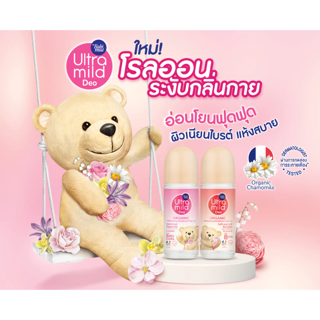 อัลตร้ามายด์ บาย เบบี้มายด์ ออร์แกนิค ไวท์เทนนิ่ง ดีโอเดอแรนท์ โรลออน อินเทนซ์ สมูท โรลออนระงับกลิ่นกาย สูตรพิเศษให้ผิวแห้งสบาย ด้วยอนุภาคขนาดเล็ก เพิ่มพื้นที่การปกป้อง เสริมประสิทธิภาพในการระงับกลิ่นกายได้ยาวนาน ช่วยเสริมความยืดหยุ่นผิว เผยผิวดูอ่อนเยาว์ ด้วยพลังของ Baby Colla ผสานกับ Niacinamide บริสุทธิ์ 99 เปอร์เซ็นต์ และ mulberry extract ที่ช่วยดูแลผิวอย่างเป็นธรรมชาติ อ่อนโยนต่อผิวด้วย Organic Chamomile จากฝรั่งเศส กลิ่นฟลาวเวอร์และพาวเดอร์รี่ โรลออนไม่อุดตัน ละอองไม่ฟุ้ง เป็นมิตรตกับสิ่งแวดล้อมปราศจากสารเคมีทำลายโอโซน (CFCs) ผลการทดสอบการระคายเคืองผิวหนังในกลุ่มตัวอย่าง 23 คน โดย DRC Thailand ในช่วงเดือน ก.พ. 2568 ไม่ก่อให้เกิดการแพ้ในกลุ่มตัวอย่างเว้นแต่การแพ้หรือระคายเคืองส่วนบุคคล ผลลัพธ์ขึ้นอยู่กับสภาพผิวแต่ละบุคคล เครื่องสำอางไม่สามารถเปลี่ยนแปลงสีผิวตามธรรมชาติได้