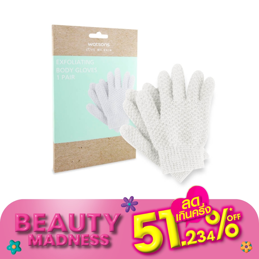 วัตสันถุงมือขัดผิวกาย 1 คู่ และยังเป็นมิตรต่อสิ่งแวดล้อมด้วยบรรจุภัณฑ์กล่องที่ผลิตจากกระดาษที่ได้จากแหล่งที่มีการปลูกทดแทนและได้รับการรับรองจาก FSC
