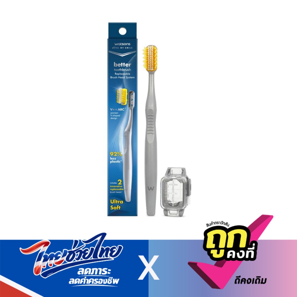 วัตสัน เบทเทอร์ ทูธบรัช แปรงสีฟันที่สามารถเปลี่ยนหัวแปรงได้ ขนแปรงเรียวแหลม ชนิดนุ่มพิเศษ รูปตัววี นวัตกรรมใหม่ของขนแปรงที่ออกแบบมาพิเศษตามสรีระของฟันเพื่อการทำความสะอาดฟันและแนวเหงือกได้อย่างมีประสิทธิภาพมากขึ้น ภายในกล่องประกอบด้วย ด้ามแปรง, หัวแปรงสำหรับเปลี่ยน, และแปรงสำหรับทำความสะอาด อีกหนึ่งทางเลือกของผู้บริโภคยุคใหม่ที่คำนึงถึงสิ่งแวดล้อม ด้วยการเลือกผลิตภัณฑ์ที่เป็นมิตรกับสิ่งแวดล้อม รักษ์โลกและดีต่อคุณภาพชีวิต ด้ามแปรงประกอบด้วยพลาสติกฟู้ดเกรดที่สามารถหมุนเวียนกลับมาใช้ใหม่ได้ พร้อมบรรจุภัณฑ์จากกระดาษที่ได้จากแหล่งป่าไม้ที่มีการปลูกทดแทน ช่วยลดการใช้พลาสติกได้ถึง 92 เมื่อเทียบปริมาณการใช้พลาสติกจากการเปลี่ยนหัวแปรงกับการเปลี่ยนแปรงสีฟัน และยังเป็นมิตรต่อสิ่งแวดล้อมด้วยบรรจุภัณฑ์กล่องที่ผลิตจากกระดาษที่ได้จากแหล่งที่มีการปลูกทดแทนและได้รับการรับรองจาก FSC