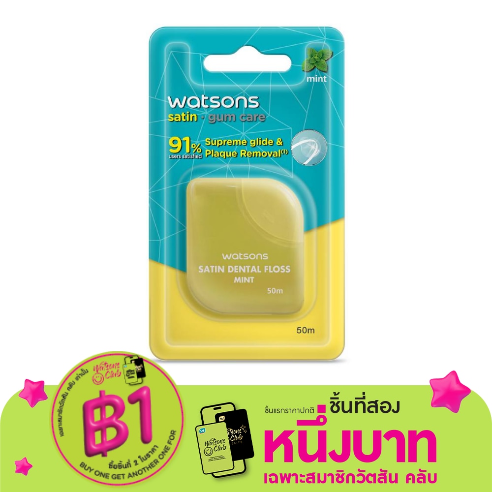 วัตสันไหมขัดฟันซาติน มิ้นท์2 ความยาว 50 เมตร ไหมขัดฟันเนื้อสัมผัสอ่อนโยน เพื่อความสบายในการใช้งาน รสมิ้นท์ช่วยมอบความสดชื่น และยังเป็นมิตรต่อสิ่งแวดล้อมด้วยบรรจุภัณฑ์กล่องที่ผลิตจากกระดาษที่ได้จากแหล่งที่มีการปลูกทดแทนและได้รับการรับรองจาก FSC