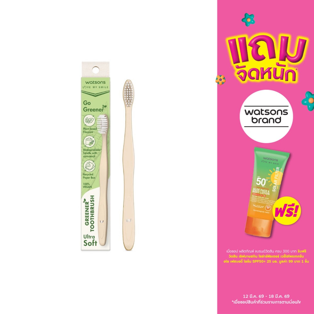วัตสัน กรีนเนอร์ ทูธบรัช (อัลตร้า ซอฟท์) แปรงสีฟันที่เป็นมิตรต่อสิ่งแวดล้อม ด้ามจับผลิตจากวัสดุที่ได้จากธรรมชาติ พร้อมบรรจุภัณฑ์จากกระดาษที่ได้จากแหล่งป่าไม้ที่มีการปลูกทดแทน ช่วยลดการใช้พลาสติกและสามารถย่อยสลายได้ ขนแปรงนุ่มพิเศษ รูปตัว S ช่วยทำความสะอาดขจัดคราบพลัคที่เกาะบนผิวฟันได้อย่างอ่อนโยนและมีประสิทธิภาพ และยังเป็นมิตรต่อสิ่งแวดล้อมด้วยบรรจุภัณฑ์กล่องที่ผลิตจากกระดาษที่ได้จากแหล่งที่มีการปลูกทดแทนและได้รับการรับรองจาก FSC