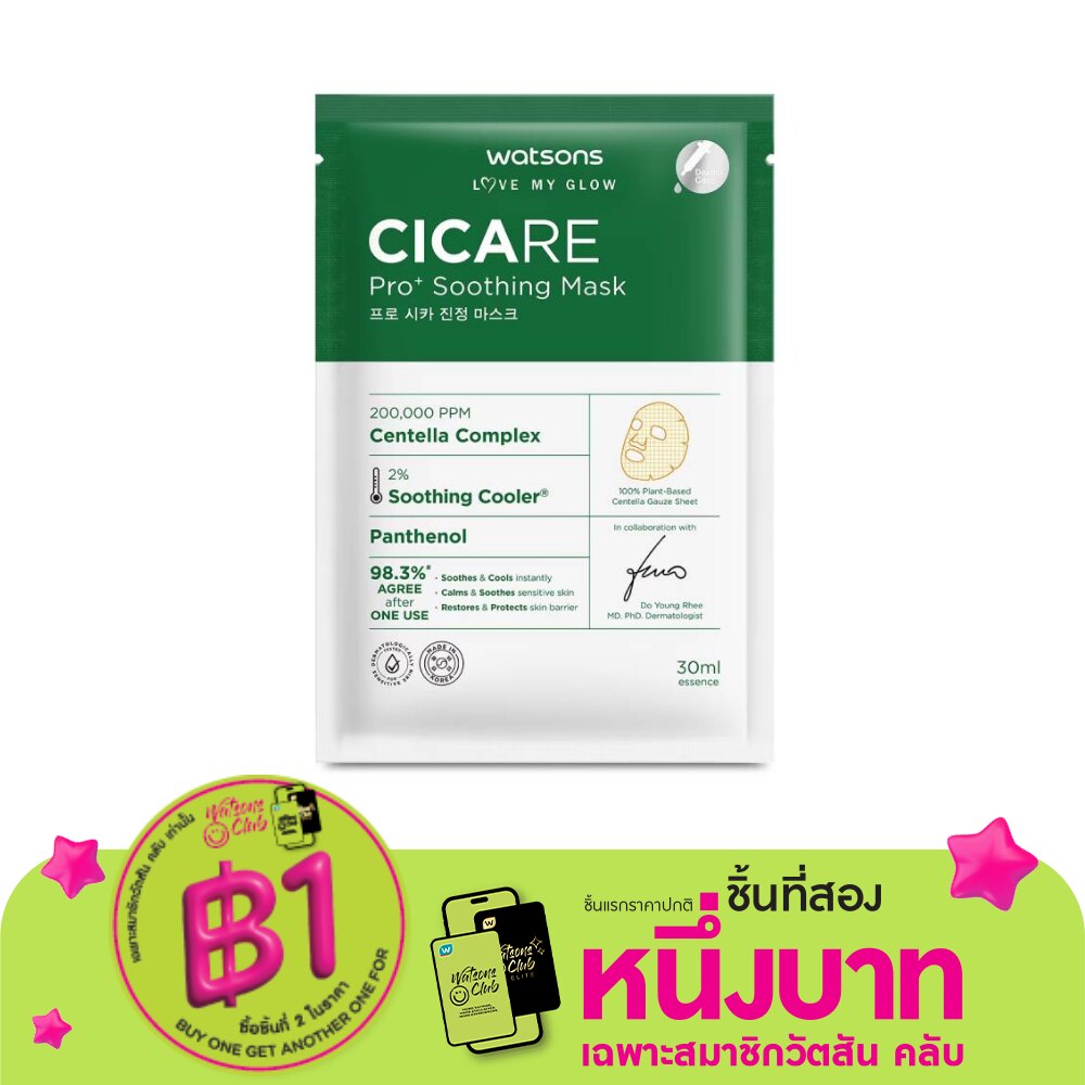 วัตสัน ซิแคร์ โปร+ ซูธติ้ง มาสก์ แผ่นมาสก์หน้าเนื้อสัมผัสแบบผ้า gauze อัดแน่นด้วย Centella Complex ถึง 200,000 ppm พร้อมส่วนผสม 2 Soothing Cooler ช่วยลดอุณหภูมิผิวให้รู้สึกเย็นสบาย อุดมด้วย Panthenol ช่วยฟื้นบำรุงเกราะป้องกันผิว ให้ความชุ่มชื้นอย่างล้ำลึกเพื่อผิวแลดูสุขภาพดี เหมาะสำหรับทุกสภาพผิว โดยเฉพาะผิวแพ้ง่ายและผิวแห้ง
