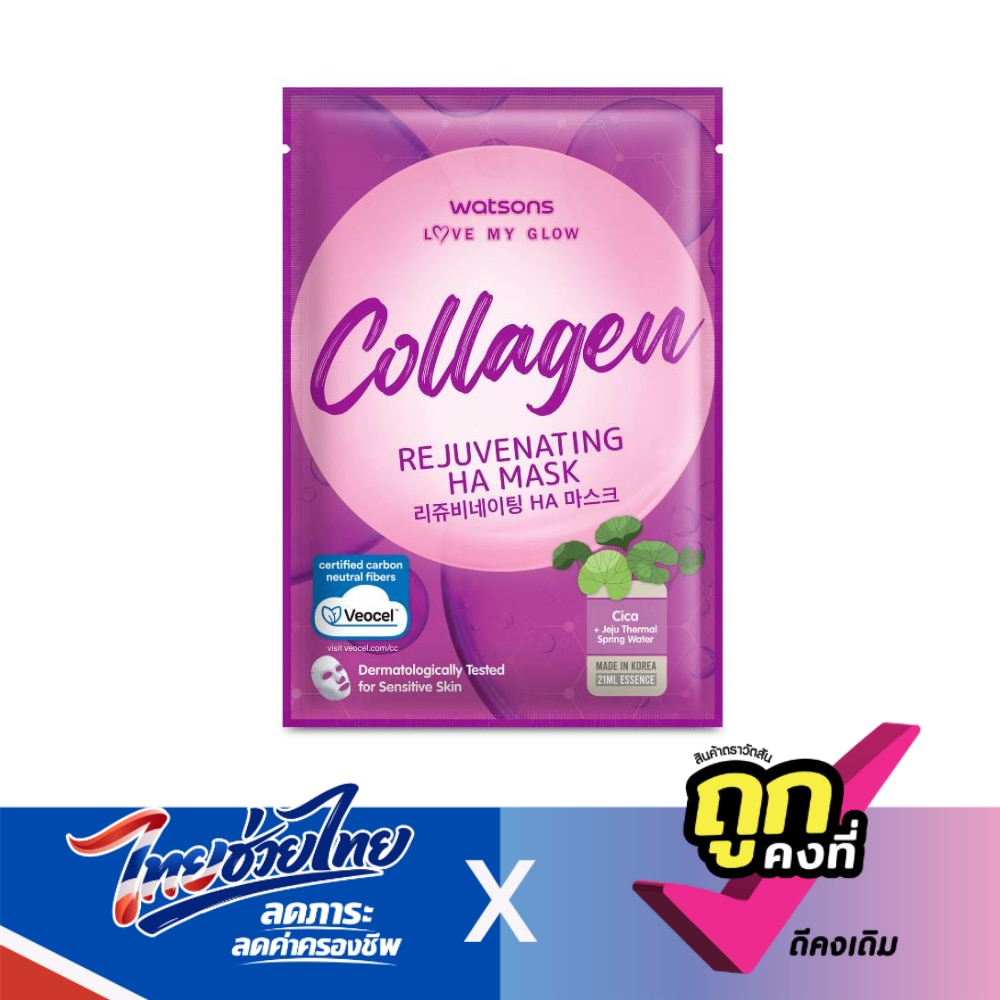 วัตสัน เลิฟ มาย โกลว์ คอลลาเจน รีจูวีเนทติ้ง เอชเอ มาสก์ แผ่นมาสก์บำรุงผิวหน้าจาก Watsons ที่จะช่วยบำรุงและเตรียมผิวหน้าให้ที่ดีที่สุดสำหรับคุณ ด้วยแผ่นมาสก์ Biodegradable VeocelTM แนบสนิทพอดีกับผิวหน้า ช่วยกักเก็บเนื้อเอสเซ้นส์และซึมสู่ผิวเพื่อตรงเข้าบำรุงได้อย่างมีประสิทธิภาพ ผลิตจากเยื่อธรรมชาติที่สามารถย่อยสลายได้ ผ่านกระบวนการผลิตที่ใช้พลังงานหมุนเวียนและได้รับการรับรองว่าเป็นกลางทางการปลดปล่อยก๊าซคาร์บอน จึงเป็นมิตรต่อสิ่งแวดล้อม เนื้อเอสเซ้นส์ชุ่มฉ่ำด้วยส่วนผสมของ Jeju Thermal Spring Water ผสาน Hyaluronic acid, Cica Extract, และคุณค่าจากคอลลาเจน มอบการบำรุงผิวอย่างล้ำลึก ช่วยเพิ่มความยืดหยุ่น ให้ผิวแลดูกระชับ