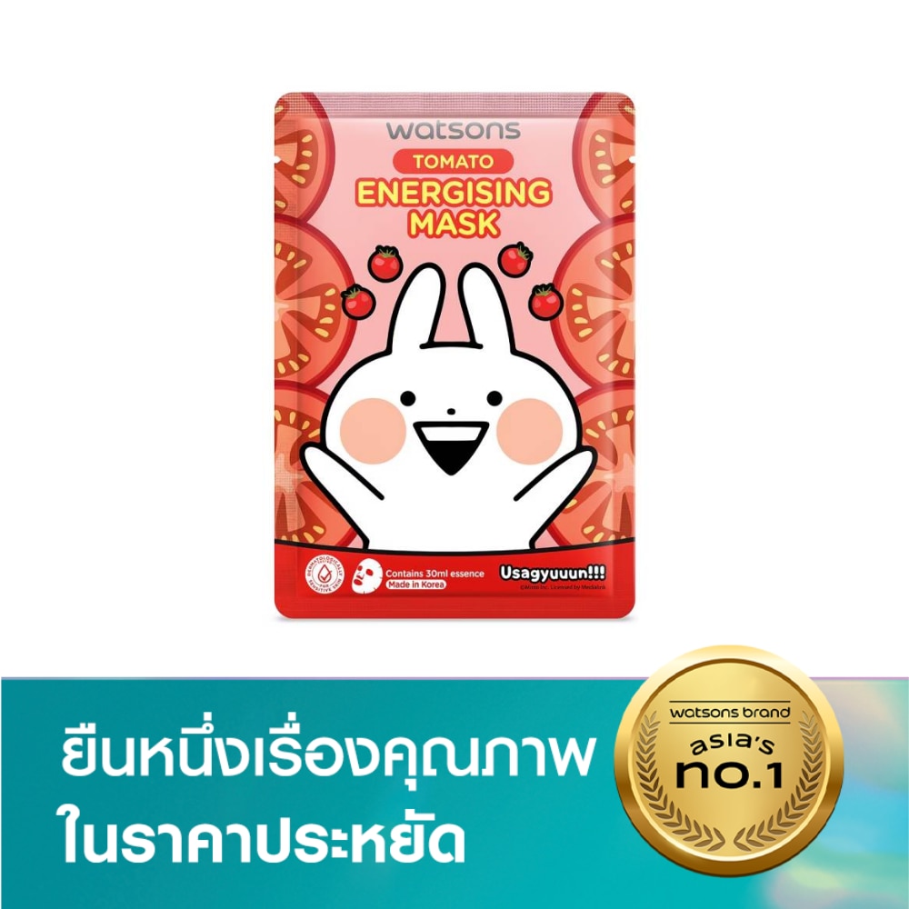 วัตสัน x Usagyuuun โทเมโท เอนเนอไจซิ่ง มาสก์ แผ่นมาสก์บำรุงผิวหน้า เพิ่มการบำรุงผิวที่มากขึ้นด้วย Double UP Fruit Power อุดมด้วยคุณค่าจากสารสกัด Tomato Fruit และ Tomato Leaf ช่วยชะลอการเกิดริ้วรอยแห่งวัย ผิวจึงแลดูอ่อนเยาว์ มีชีวิตชีวา แผ่นมาสก์ผลิตจากเยื่อไผ่ธรรมชาติที่สามารถย่อยสลายได้ ให้สัมผัสที่ละเอียดอ่อน แนบสนิทพอดีกับผิวหน้า สูตรวีแกน100 ปราศจากส่วนผสมที่ได้จากสัตว์ และส่วนผสมที่อาจก่อให้เกิดการระคายเคืองทั้ง แอลกอฮอล์ พาราเบน และสารแต่งสีสังเคราะห์ ผ่านการทดสอบโดยผู้เชี่ยวชาญด้านผิวหนัง ผลิตภัณฑ์นี้ ปราศจากส่วนผสมที่ไม่พึงประสงค์ 20 ชนิด ผลิตจากวัสดุที่มาจากธรรมชาติ จึงช่วยลดการใช้พลาสติก