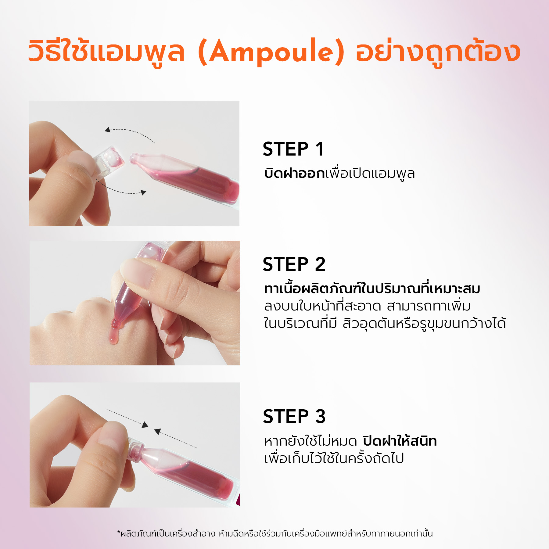 ทาเซรั่มในปริมาณที่เหมาะสมลงบนผิวหน้าและลำคอในตอนกลางคืน โดยเว้นช่วงรอบดวงตาและรอบริมฝีปาก ในช่วงสัปดาห์แรก ให้ใช้ 2 ครั้งต่อสัปดาห์ เมื่อผิวเริ่มปรับตัวได้แล้ว สามารถค่อย ๆ เพิ่มความถี่การใช้เป็นวันเว้นวันได้