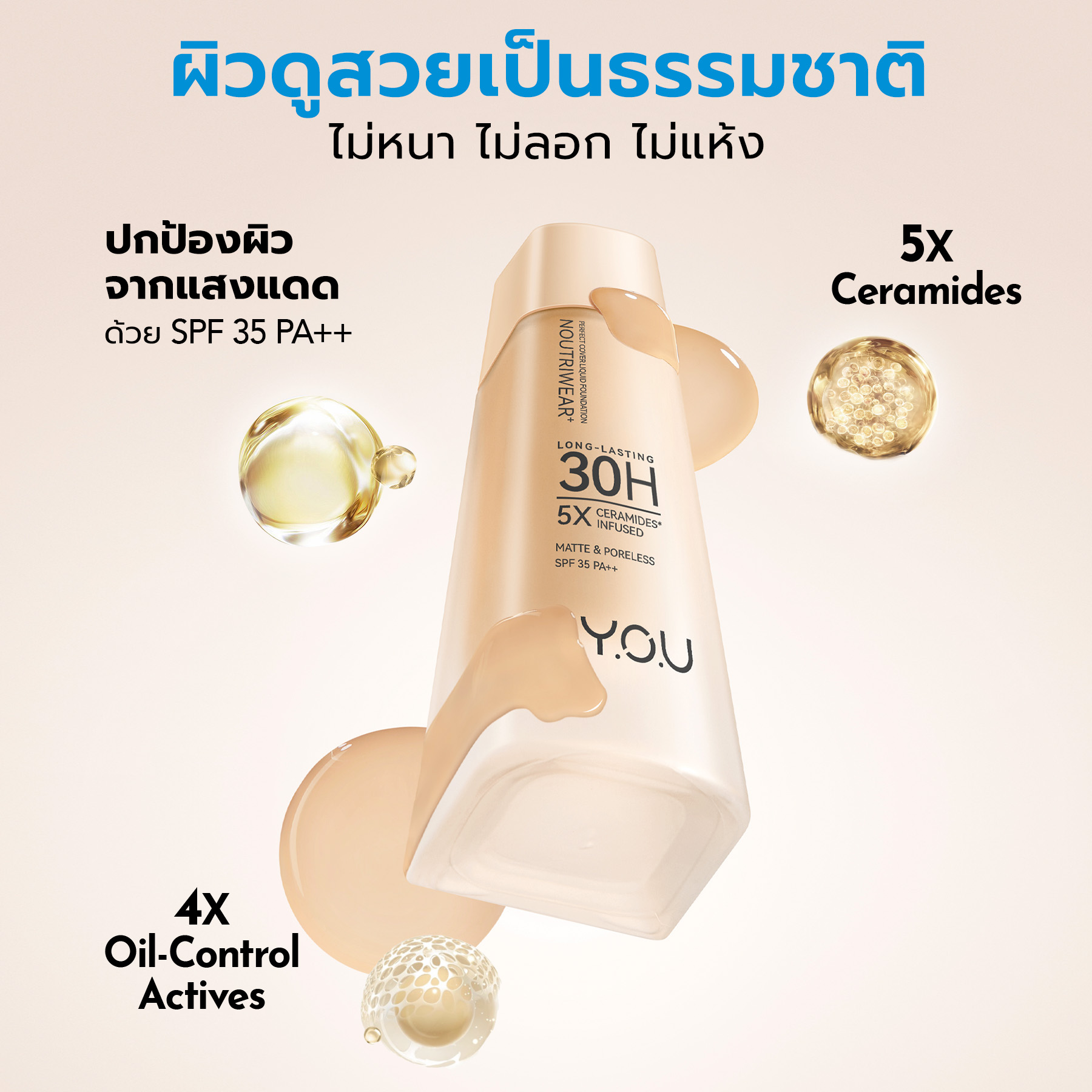 NoutriWear Perfect Cover Velvet Liquid Foundation รองพื้นที่ให้การปกปิดยาวนานสูงสุดถึง 30 มี เทคโนโลยี Litestay และสารบำรุงผิวอื่นๆ 1. 5X เซราไมด์ ช่วยเสริมเกราะป้องกันผิวให้แข็งแรง พร้อมมอบความชุ่มชื้นให้ผิว 2. สารสกัด Immortelle C-lock Essence สารสกัดจากดอก Immortelle (Helichrysum stoechas) ช่วยคงความยืดหยุ่นของผิว 3. วิตามิน B5 เสริมเกราะป้องกันตามธรรมชาติของผิวให้สามารถต้านทานมลภาวะและปัจจัยภายนอกได้ดีขึ้น 4. สารสกัดจาก Witch Hazel (Hamamelis Virginiana) ช่วยควบคุมความมันส่วนเกินบนผิวหน้า 5. สารสกัดจากใบบัวบก (Centella Asiatica) ปลอบประโลมผิว เหมาะสำหรับผู้ที่มีแนวโน้มเป็นสิวง่าย 6. สารสกัดจากใบคาเมลเลีย (Camellia Japonica) อุดมไปด้วยวิตามินอีทำหน้าที่เป็นสารต้านอนุมูลอิสระอย่างมีประสิทธิภาพ